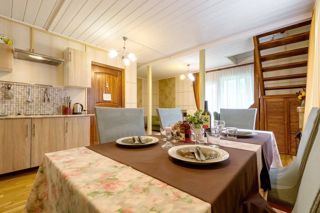 Кухня – столовая единое пространство, что даёт преимущество оставаться со своими близкими во время приготовления трапезы и сразу же выставлять угощение на большой стол.